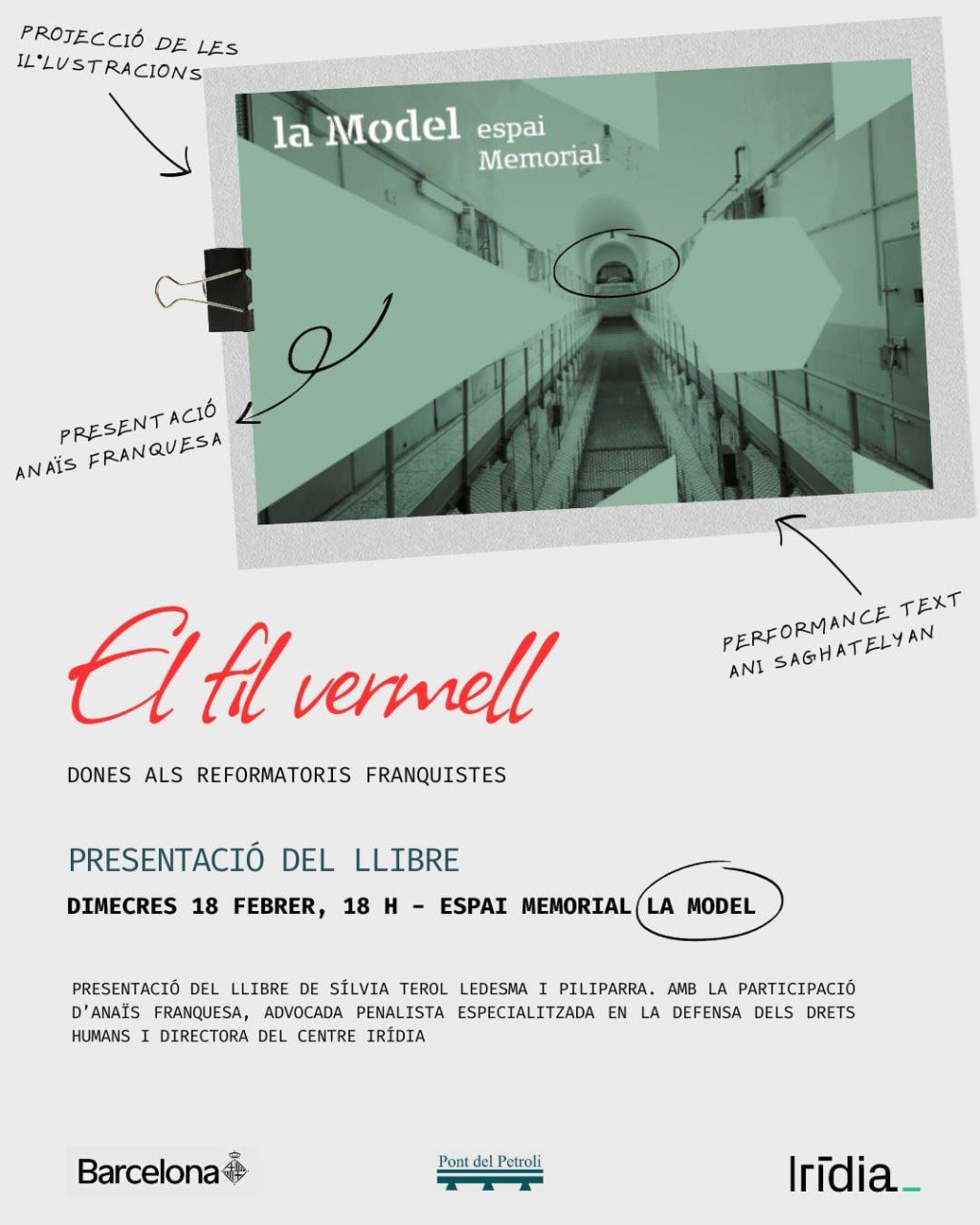 El proper dimecres 18 de febrer a les 18 h, l’Espai Memorial La Model acull la presentació del llibre El fil vermell, amb relats de Sílvia Terol Ledesma i il·lustracions de piliparra, una obra que recupera la memòria de les dones internades als reformatoris del Patronato de Protección a la Mujer durant el franquisme.