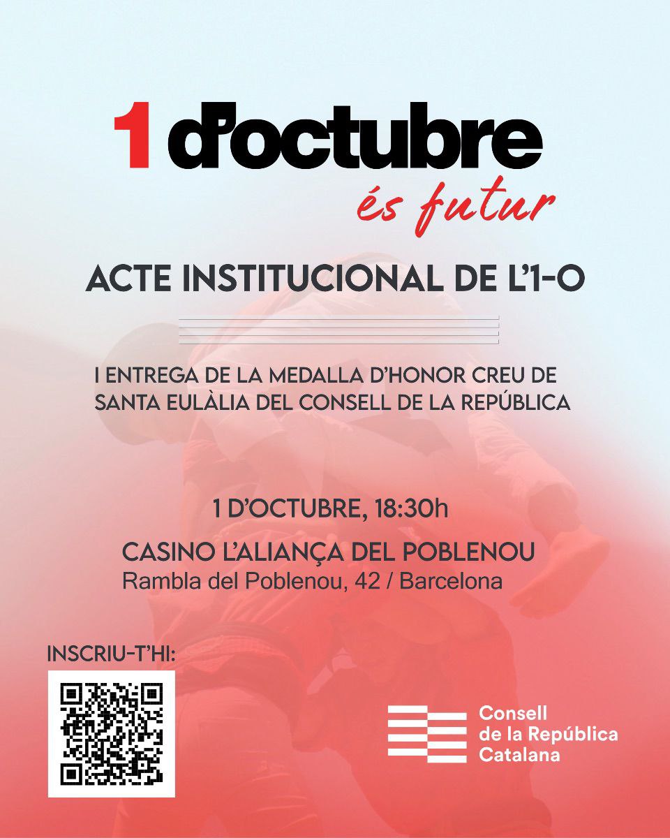 El Consell de la República celebra l’aniversari de l’1 d’Octubre amb un acte institucional i l’entrega de la Medalla d’Honor Creu de Santa Eulàlia, com a reconeixement a la lluita democràtica i la defensa del dret a l’autodeterminació.