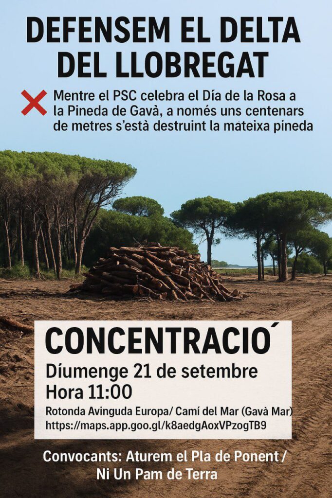 Mentre el PSC celebra el Dia de la Rosa a la Pineda de Gavà, a pocs metres s’està destruint la mateixa pineda amb màquines i especulació urbanística.