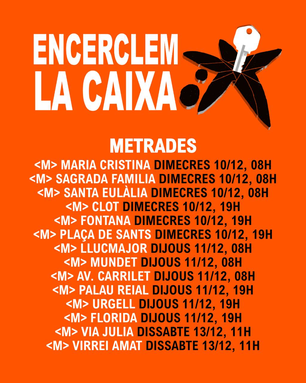Accions coordinades en diferents estacions de metro de Barcelona al llarg de tres dies, amb convocatòries de matí i de vespre a punts estratègics dels barris. L’objectiu és visibilitzar el conflicte i ampliar la pressió perquè no quedi cap edifici exclòs de l’acord.