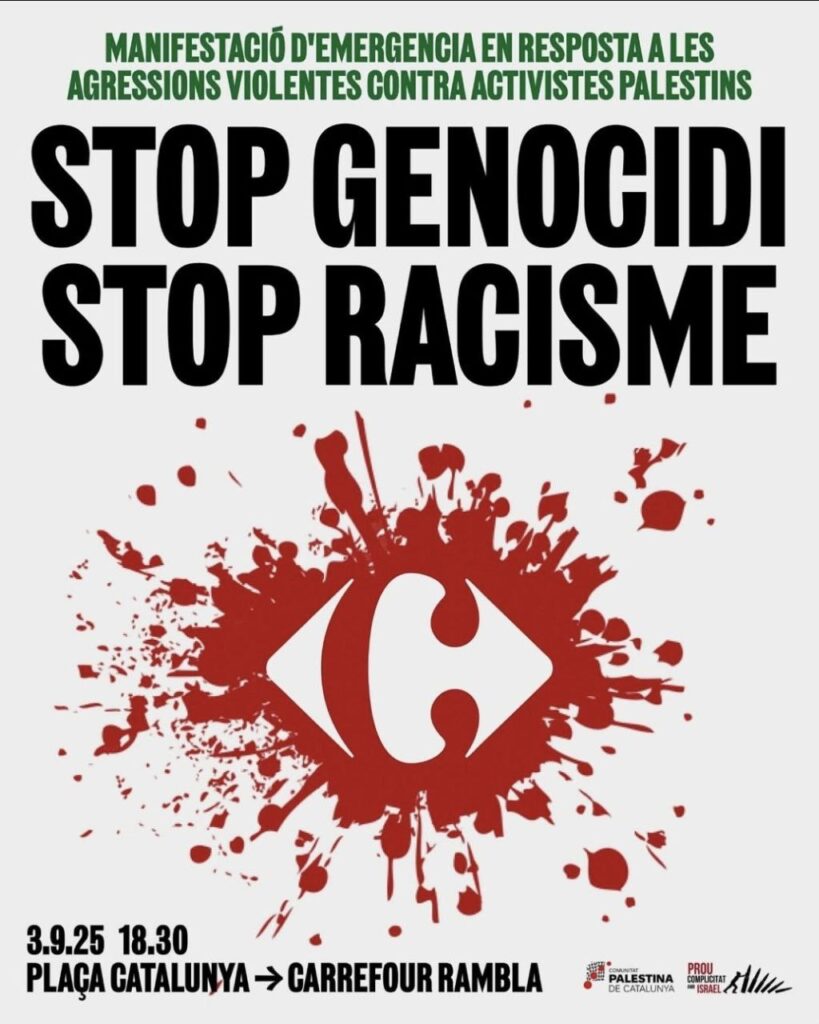 🔴 S’ha convocat una manifestació per aquesta tarda a les 18:30h a Plaça Catalunya per seguir protestant contra el genocidi a Palestina. També en motiu de l’agressió que van rebre dos activistes el dilluns que s’estaven manifestant davant del Carrefour Market de Les Rambles de Barcelona en una campanya de boicot contra empreses dins del moviment BDS (Boicot, Desinversions i Sancions a Israel). Els activistes van ser colpejats i ruixats amb gas pebre.
